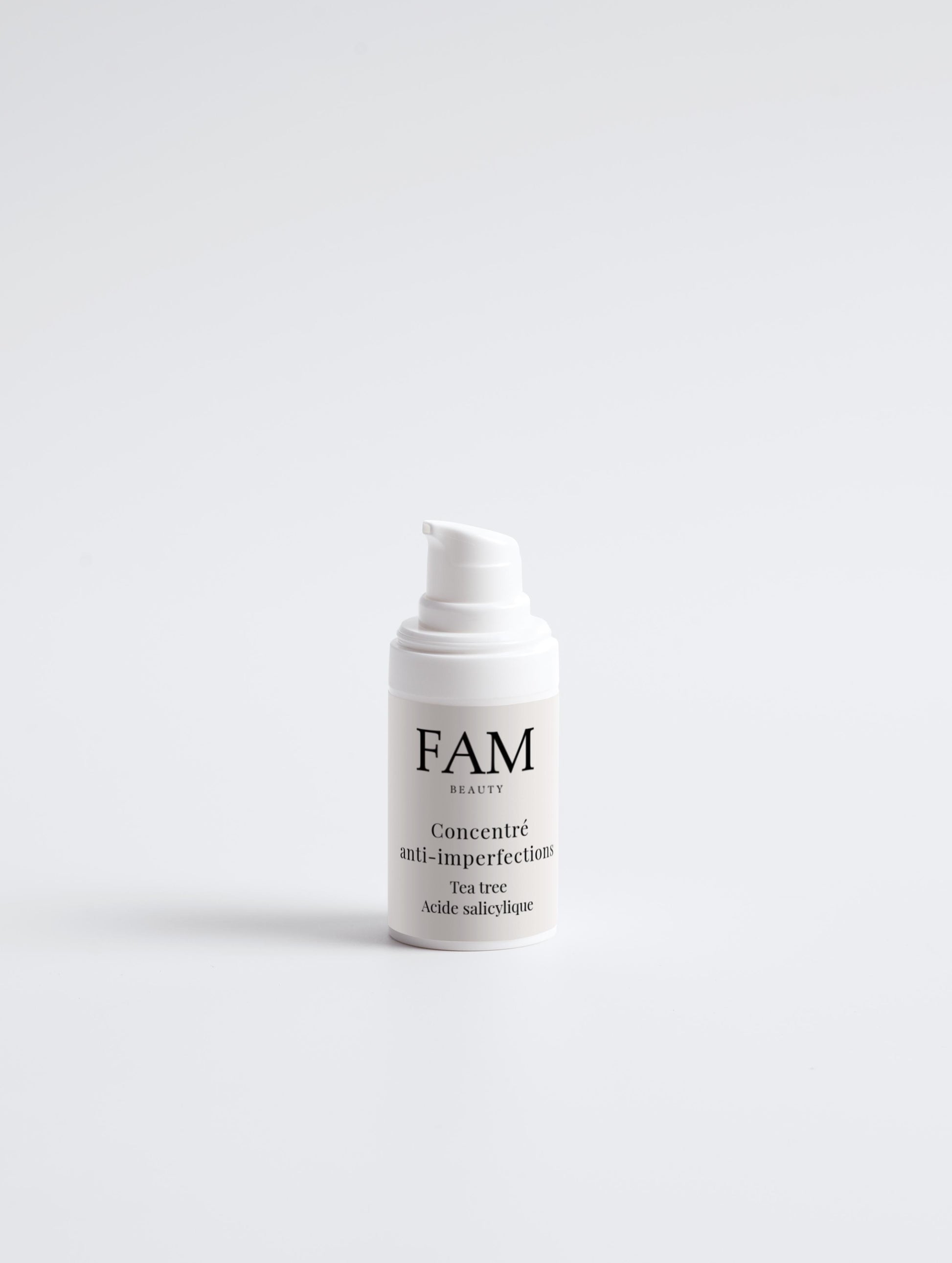 Le concentré anti-imperfections FAM est infusé d'huile essentielle d'arbre à thé et d'acide salicylique, qui aide à apaiser l'imperfection et la peau à tendance acnéique.